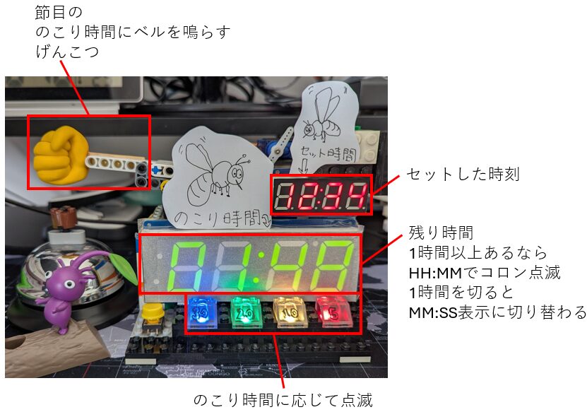 セットした時間と残り時間を表示するようにして、そんで、節目でげんこつベルを鳴らしたい、と考えながら、そのげんこつアームを探しに作品箱をあけにいった。サーボの土台や、お静かに願います看板、が外れて無残な雰囲気だったが、見ているうちに思い入れがよみがえった。これでリメイクしよ。