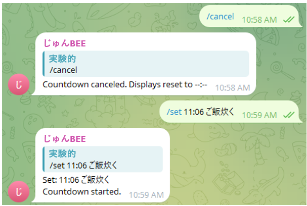 使えるコマンドは/setと/cancel。/setの後にHH:MMで目標時間、そのあとスペースに続いて何の時間なのかを書いて送信するだけ。メッセージはRaspberry piに住むボット君にとどけられ、あとはプログラムがメッセージに応じてガジェットを動かしてくれます。